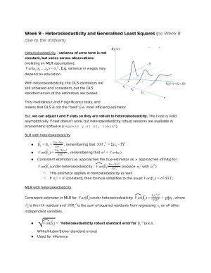 A full set of notes for Intermediate Econometrics, with a number of worked examples, STATA formulas, graphical depictions and mathematical derivations. These notes got me an HD in this course. It has clear memory aids, especially for difficult mathematical and statistical concepts, and emphasises the econometric techniques AS WELL AS the assumptions that need to hold for them to be valid. Topics: - The Nature of Econometrics, Probability and Statistics Review - Simple Linear Regression and Deriving OLS Estimates - Multiple Linear Regression, Non-Linear Functional Forms, R-squared - Assumptions and Properties of OLS Estimators (Simple and Multiple), Asymptotic Properties of OLS - Statistical Inference and Hypothesis Testing in Multiple Linear Regression (t-test, F-test, p-value) - Dummy Variables and Interaction Terms - Specification Issues and Endogeneity (Omitted Variable Bias, Overspecification, Multicollinearity, Endogeneity, Proxy Variables, Functional Form Misspecification and Testing, Measurement Error in Dependent and Independent Variables) - Heteroskedasticity, Breusch-Pagan Test, Modified White Test, Generalised Least Squares (Known and Unknown Heteroskedasticity) - Endogeneity and Instrumental Variables: Two-Stage-Least-Squares - Treatment Effects and Panel Data Models: Difference-in-Differences, First-Differences Panel Estimator, Fixed-Effects Model, Random-Effects Model