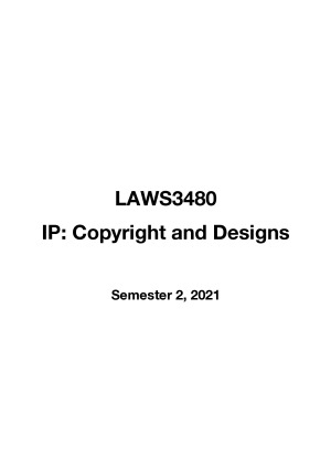 These notes cover the entire course for IP: Copyright and Designs. The course is highly interesting and relevant to the real world. These notes earned me a Distinction mark in this subject. Each topic has extensive case summaries and analysis of statutory provisions which you can use in exams. I make sure to clearly set out the logical flow of answering a problem question from topic to topic: when a work is subject to copyright, who owns the copyright to a work, when copyright is infringed, what exclusive economic rights attach to copyright. Topics: - Introduction to copyright, including history and basic principles - Criteria for subsistence: when does copyright subsist in a work? (originality) - Subject matter (literary, dramatic, musical, artistic works; sound recording, cinematograph film, broadcast) - Ownership and exploitation - Infringement (causation, objective similarity, substantial part) - Exclusive economic rights (reproduce, public, perform in public, communicate to public, adaptation) - Authorisation (online, safe harbours) - Exceptions (fair dealing, research or study, criticism or review, parody or satire, reporting of news, other exceptions, comparative law with US and UK) - Moral and performers' rights - Remedies - Design law - The copyright-design overlap