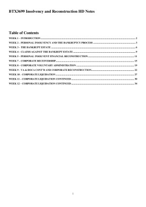 These are the notes for BTX3699 Insolvency at Monash Uni. They cover all the course content (see contents below). These notes helped me achieve a HD in the unit, and helped me to ace the exam and reinforce my learning. All the best! Table of Contents WEEK 1 – INTRODUCTION 2 WEEK 2 – PERSONAL INSOLVENCY AND THE BANKRUPTCY PROCESS 3 WEEK 3 – THE BANKRUPT ESTATE 6 WEEK 4 – CLAIMS AGAINST THE BANKRUPT ESTATE 9 WEEK 5 – PERSONAL INSOLVENT FINANCIAL RECONSTRUCTION 11 WEEK 7 – CORPORATE RECEIVERSHIP 15 WEEK 8 – CORPORATE VOLUNTARY ADMINISTRATION 19 WEEK 9 – VA & DOCA CONT’D AND CORPORATE RECONSTRUCTION 22 WEEK 10 – CORPORATE LIQUIDATION 27 WEEK 11 – CORPORATE LIQUIDATION CONTINUED 30 WEEK 12 – CORPORATE LIQUIDATION CONTINUED 34