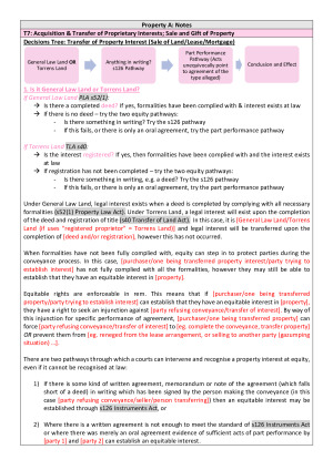 These notes provide a clear step by step approach for responding to questions. Structured answers are offered for each topic and should be adapted accordingly to the relevant question. Additionally, a brief summary of cases and legislation is provided to help analogise during the exam. Topics covered: - Acquisition & Transfer of Proprietary Interest - Leasehold Estates (lease requirements, leasehold covenants, assignment) - Creation of Leasehold Interests - Contractual Licenses - Easements - Restrictive Covenants - Security Interests