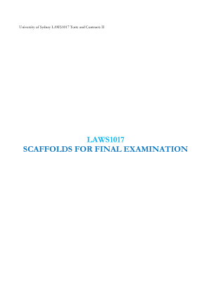 These scaffolds were made during the Semester 2 Winter Intensive and contain all the latest readings and cases. These scaffolds were created by 3 students who all obtained 75+ with the main contributor achieving 83. They are clear, easy to understand, in a step, by step format which allow you to solve any problem question. They were used for both in class Quizzes and the Final Examination. EACH TOPIC HAS 1. Summary Scaffold (The main overriding questions to ask) 2. A Intro sentence which states what the general topic is about 3. Proper Scaffold with references (in Blue) Tips from the lecturer Topics Contracts 1. Introduction 2. Damages: Causation and remoteness of damage in contract 3. Measure of damages in contract and sums fixed by contract 4. Introduction to vitiating factors and the remedy of rescission 5. Duress and mistake 6. Undue influence, unconscionable conduct an unfair contract terms 7. Misrepresentation at general law and statutory liability for misleading or deceptive conduct Torts 8. The tort of trespass to land 9. The tort of private nuisance 10. Tort liability for interference with goods 11. Liability in tort for purely economic loss I: negligent misstatements and professional negligence 12. Liability in tort for purely economic loss II: third party property damage and third party injury 13. Multiple wrongdoers – proportionate liability