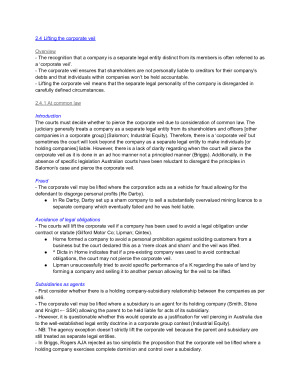 These are the notes that I used to receive a 84 in law 3112. These contain a summary of every single case in the unit. I made these notes using the required readings, lectures, tutorials, lexis nexis study guides and various other textbooks on property law in the library. They contain a summary for all of the topics and are workable notes that can be used in exam conditions. Topic 1: Introduction to corporations law Topic 2: Incorporations and its effects Topic 3: The constitution and the replaceable rules Topic 4: Corporate contracting Topic 5: Share (equity) capital, debt capital and dividends Topic 6: Directors, members and corporate decision making Topic 7: Directors' duties Topic 8: Consequences of contravention and relief from liability Topic 9: Members' remedies Topic 10: Corporate mortality