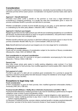 Achieved a final unit mark of 85 (High Distinction). These summary notes are a useful resource referencing relevant case law and legislation for the LAWS1150/JURD7150 Final Exam. The notes cover: 1. Contract (agreement, consideration, intention and certainty); 2. Privity (and exceptions thereto); 3. Remedies; 4. Property and property interests, including fixtures, chattels, and adverse possession; 5. Torts applicable to property interests; 6. Bailments; 7. Equitable doctrines of conversion and part performance; and 8. Estoppels and remedies. Flowchart diagrams are also included for licenses, property interests, adverse possession, and estoppels.