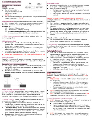 Summary HD exam notes with comprehensive flow charts Covers topics: 1. Business Organisations & the History of the Corporation 2. Corporate Personality & the Process of Incorporation 3. The Corporate Constitution & Internal Rules 4. Corporate Contracting 5. Corporate Decision-making, Meetings & Reporting 6. Corporate Finance 7. Corporate Fundraising 8. Directors' Duties Part 1 9. Directors' Duties Part 2 10. Members Rights & Remedies 11. Receivership, Schemes of Arrangement & Voluntary Administration 12. Corporate Takeovers Flow charts for topics: 2. Corporate Personality & the Process of Incorporation 4. Corporate Contracting 7. Corporate Fundraising 11. Receivership, Schemes of Arrangement & Voluntary Administration