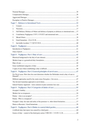 The preview of the notes includes some pages from each of these parts. The notes are the result of all the readings, lecture notes, academic articles and others notes I was able to read. The topics include: - Scope of tort law - Historical background of tort law - Trespass to the person - Action on the case for wilful injury - The statutory action for psychiatric injury to relatives of victims of intentional wrongs - Damages for intentional torts to the person - Invasion of privacy as a tort - Defences to intentional torts - Negligence: duty of care - Negligence: breach of duty - Causation and remoteness of damage/scope of liability - Defences to negligence - Assessment of damages for personal injuries - Vicarious liability and non-delegable duties in negligence - Joint and several liability for personal injury; contribution rights - Compensation to 3rd parties following injury to or death of the primary victim