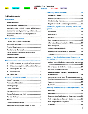 These scaffolds have been carefully constructed to include all of the specific sections and subsections of the legislation covered in this course. This level of detail is particular important for success in this course. These scaffolds were the only material I relied on during the final exam. Criminal Procedure Topics: 1. Introduction to criminal procedure 2. Police power and discretion 3. Bail and appeal 4. Pre-trial process, the decision to prosecute and mandatory defence disclosure 5. Sentencing and punishment Civil Procedure Topics: 6. Civil process, open justice, fairness and the adversarial system 7. Matters preceding litigation and commencing proceedings 8. Pleadings and particulars, gathering evidence in civil cases 9. Privilege 10. Trial or no trial
