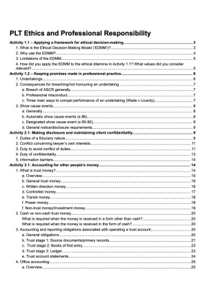 BENEFITS OF THESE NOTES - These notes cover every examinable topic for the College of Law Practical Legal Training Property Practice oral assessment (including the tasks that are required to be submitted prior to the oral); - These notes are based on feedback from lecturers on activity submissions and the practice papers supplied by the College of Law; - You can simply just read from these notes when responding to questions asked of you; and - Hyperlinked table of contents and headings will make it easy for you to swiftly navigate through these notes during the exam. Topics covered include (see the table of contents for further detail): - Applying a framework for ethical decision-making - Keeping promises made in professional practice - Making disclosure and maintaining client confidentiality - Accounting for other people's money - Accounting and billing - Facilitating access to justice - Knowledge of practice area