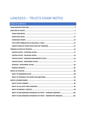 Taken in T2 2023 Used these notes in the exam to get a 81% overall mark Includes comprehensive case summaries for class as well Exam Answer Structure Creation Of Trusts Three Certainties Quistclose Trust Charitable Trusts Statutory Formalities Of Creating A Trust Constitution Of Trusts (For Trusts By Transfer) Powers & Duties Of Trustees Trustee Duties - Custodial Duties Trustee Duties - Fiduciary Duties Trustee Duties - Ongoing Management Duties Trustee Duties - Investment Duties Defences - Investment Duties General Defences Rights Of Trustees Right To Indemnification Right To Approach The Court For Directions Rights Of Beneficiaries Right To Give Consent Right To Call (Get) Trust Property Right To Remove A Trustee Right To Seek Remedies For Breach Of Trust – Personal Remedies Right To Seek Remedies For Breach Of Trust – Proprietary Remedies