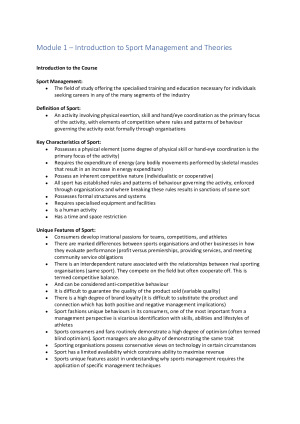 Full Course Notes from Sport Management Principles Covers Topics - Module 1 - Introduction to Sport Management and Theories Module 2 - The Principles of Systems Theory Module 3 - Organisational Theories and Relationships Module 4 - Strategic Sport Management Module 5 - Sport Governance Module 6 - Sport Law and Governance Module 7 - Sport Organisation Structures/Typologies Module 8 - Leadership in Sport Module 9 - Organisational Benchmarking and Performance Module 10 - Application of Human Resources in Sports Management Module 11 - Sport Management Challenges These notes include the covered lectures as well as adding additional notes from the relevant textbooks on each topic and comprehensively covers each topic. Was used to get Distinction in the course.