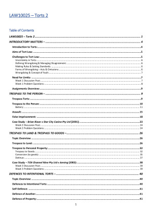 - Student scored highest mark in Torts 2 this semester - Fully compiled & up-to-date Torts 2 notes - Comprehensive semester notes - Includes colour-coding system with headings & subheadings - Tutorial examples to help understanding of concepts and content - High Distinction notes - VERY detailed case analysis and summaries included - Includes all relevant case law & legislation - Easy to navigate and find things specific to what is needed in assessments - Clear notes - easy to follow