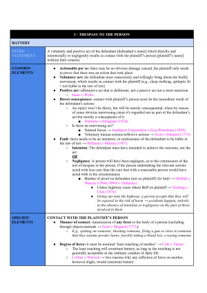 A summarised step-by-step exam script for your LAW1113 exam! Includes: • trespass to the person • trespass to land and private nuisance • negligence Topic list 1. Battery 2. Assault 3. False imprisonment 4. Defences and remedies 5. Trespass to land 6. Private nuisance 7. Negligence 8. Vicarious liability All relevant legislative provisions (green) and case law (pink) is included in a concise and easy to exam-cram way to help you get through SWOTVAC and exam period! Good luck <3