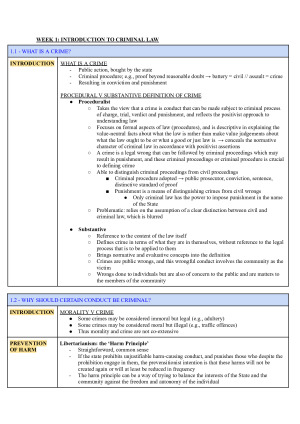 Detailed notes including all relevant case law (pink), legislative provisions (green) AND BONUS detailed case summaries to assist you in preparing for your crim law assessments and final exam!! Good luck <3 Includes • introduction and background information • elements of a crime • non-fatal, non-sexual offences, sexual offences • homicide • criminal defences • bonus detailed case summaries!! Topic list 1. Introduction to criminal law 2. Framework of the criminal law 3. Sentencing 4. Elements of a crime 5. Non-fatal, non-sexual offences against the person 6. Sexual offences and consent 7. Homicide 8. Defences 9. Detailed case summaries for all abovementioned topics