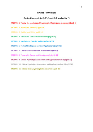 -scored 100% on the open book online test (worth 20% of grade) using these notes -comprehensive summary of ALL modules week 1-11 -modules broken down into core learning objectives (clearly marked with *) -includes all relevant content needed for each assignment and the online quiz -includes notes based on seminar activities and tips given from seminar tutor (attended all seminars) TOPICS INCLUDED: MODULE 1: Tracing the Landscape of Psychological Testing and Assessment (pg 2-6) MODULE 2: Norms and Reliability (pg6-13) MODULE 3: Validity and Utility (pg13-19) MODULE 4: Ethical and Cultural Considerations (pg19-24) MODULE 5: Intelligence: Theories and Issues (pg24-33) MODULE 6: Tests of Intelligence and their Applications (pg33-46) MODULE 7: Child and Developmental Assessment (pg46-62) MODULE 8: Personality Assessment Fundamentals (pg62-68) MODULE 9: Clinical Psychology: Assessment and Applications Part 1 (pg68-72) MODULE 10: Clinical Psychology: Assessment and Applications Part 2 (pg72-78) MODULE 11: Clinical Neuropsychological Assessment (pg78-85) Good luck with the unit!