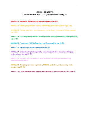 -includes comprehensive summary of all modules week 1-10 (there was no week 11) -perfect resource for open book multiple choice exam to find answers (**scored 80% on exam using these notes**) -modules broken down into core learning objectives (clearly marked with *) which compose the examinable content -includes all relevant content needed for each assignment and the exam (plus additional notes from all of the modules’ practice exam questions) Topics covered in modules: MODULE 1: Reviewing literature and levels of evidence MODULE 2: Starting a systematic review: formulating a research question MODULE 3: Putting together a search strategy and writing a systematic review protocol MODULE 4: Executing the systematic review protocol (finding and sorting through studies) MODULE 5: Preparing a PRISMA flowchart and Assessing Bias MODULE 6: Introduction to meta-analysis MODULE 7: Understanding heterogeneity, assessing publication bias and writing up a systematic review MODULE 8: More on effect sizes and a brief look at meta-analyses not examining interventions MODULE 9: Wrapping up: meta-regression, PRISMA guidelines, and assessing meta-analyses MODULE 10: Why are systematic reviews and meta-analyses so important? Good luck with the unit!