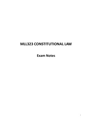 These are my fully comprehensive detailed notes I made for MLL323 Constitutional Law. They were highly beneficial for the online quiz, the assignment and the exam, and allowed me to score a HD for the subject. This is all I used for the exam. I have spent countless hours compiling these notes. These notes are comprehensive and integrate everything learnt in the subject, including the prescribed readings from the textbook, lecture notes, tutorial answers, case summaries, etc. I hope these notes help you smash Constitutional Law! These notes cover: 1 | AN INTRODUCTION TO AUSTRALIAN CONSTITUTIONALISM 2 | THE LEGISLATURE (PARLIAMENT) 3 | LEGISLATIVE PROCEDURES 4 | THE JUDICIARY 5 | CHARACTERISATION OF THE CONSTITUTION 6 | THE EXECUTIVE 7 | FINANCIAL & ECONOMIC POWERS 8 | EXTERNAL AFFAIRS & EXTRATERRITORIALITY 9 | INCONSISTENCY 10 | RIGHTS & FREEDOMS 11 | SEPARATION OF POWERS