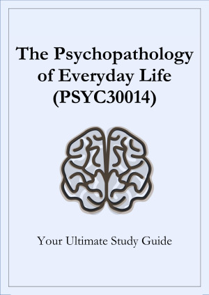 🌟 Hey There! 🌟 Are you looking to smash The Psychopathology of Everyday Life (PSYC30014) this semester? If so, you’re in the right place! 😏 I’ve invested countless hours crafting the ultimate study guide. This isn't just another set of notes; it's a comprehensive, all-encompassing resource designed to give you an edge! ___________________________________________________________________________ 🔥 All lecture material, tutorial content and readings have been synthesised and distilled into a single powerful document 🔥 Enjoy a full, 90 MCQ mock exam (made by me) to simulate the real thing, complete with an answer key ___________________________________________________________________________ ✅ 𝗥𝗲𝗺𝗲𝗺𝗯𝗲𝗿, 𝗴𝗮𝗶𝗻𝗶𝗻𝗴 𝗮𝗻 𝗲𝗱𝗴𝗲 𝗶𝗻 𝘆𝗼𝘂𝗿 𝘀𝘁𝘂𝗱𝗶𝗲𝘀 𝗶𝘀 𝗮𝗻 𝗶𝗻𝘃𝗲𝘀𝘁𝗺𝗲𝗻𝘁 𝗶𝗻 𝘆𝗼𝘂𝗿 𝗳𝘂𝘁𝘂𝗿𝗲 𝘀𝘂𝗰𝗰𝗲𝘀𝘀 ✅ ___________________________________________________________________________ 𝗖𝗼𝗻𝘁𝗲𝗻𝘁 𝗗𝗲𝘀𝗰𝗿𝗶𝗽𝘁𝗶𝗼𝗻: Week 1: Introduction to Psychopathology Week 2: Models of Psychopathology Week 3: Anxiety Disorders Week 4: Affective Disorders Week 5: Cultural Considerations Week 6: Lifestyle Factors and Mental Health Week 7: Psychotic Disorders Week 8: OCD Spectrum Disorders Week 9: Trauma and Related Disorders Week 10: Substance Use Disorders Week 11: Personality Disorders Week 12: Eating Disorders Wishing you all the very best this semester! 😊