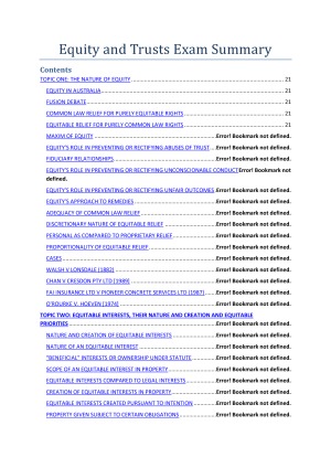 chieved a High Distinction for the assignment and an overall Distinction for the uni. Headings, sub-headings and bullet points plus table of contents. Over 150 pages. Includes: > The Nature of Equity >Equitable Interests, Their Nature and Creation and Equitable Priorities >Assignment of Property >Relationships of Trust >Unconscionable Conduct >Nature and Functions of a Trust; Trusts Distinguished from other Relationships >Express and Discretionary Trusts >Charitable and Purpose Trusts >Resulting and Constructive Trusts >Trustees and Beneficiaries >Equitable Remedies >Misc. Equitable Doctrines
