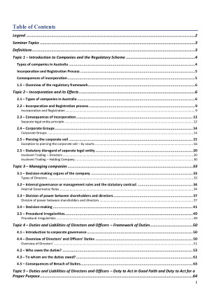 Notes including information from lecture material, case readings, and pinpoint citations. These are the notes I created throughout the semester to aid in my understanding of Corps Law. If you are looking for an exam template that can be used in the exam or to assist you in creating your exam structure, look at H1 Corporations Law EXAM TEMPLATE 2023. Topics include: 1. Introduction to companies and the regulatory scheme 2. Incorporation and its effects 3. Managing companies 4. Duties and liabilities of directors - Framework of duties 5. Duties and liabilities of directors and officers - Duty to act in good faith and duty to act for a proper purpose 6. Duties and liabilities of directors and officers - Duty of care 7. Duties and liabilities of directors and officers - Loyalty 8. Shareholders actions (personal and statutory derivative action) 9. Corporate liability 10. Share capital *These subject notes are to be used to assist in your preparation and studying of Corps law. Please ensure you use your own words for your benefit.*