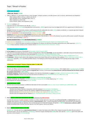 These notes are structured in a clear and logical manner to cover the contents from week 1 to week13. The notes are concise yet comprehensive, including all relevant case law and legislations. These notes serve as a perfect reference for final exam, as it not only provides you with a scaffold to approach potential questions under each topic, but also sufficient authority to support your answers! With the help of these notes, I achieved High Distinction for my final exam and an overall 86 for this subject. Topics included are: • Pre-registration issues: Pre-Registration Contract, Constitutions, Promoter • Types of business organizations: Structure, Fund, Capacity, Requirements • External Relations and Corporate Liability • Disclosure Requirements • Maintenance of Capital • Appointment and Removal of Directors • Directors and Officer's Duties • Meetings and Members rights • Financial Difficulties