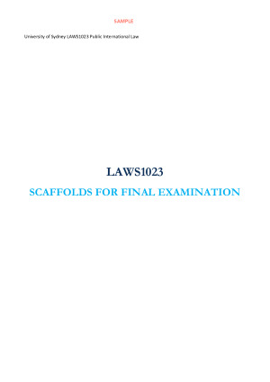 These scaffolds were made during the Semester 1 2023 and contain all the latest readings and cases. These scaffolds were used for mid-sem and final examinations and have been created to contain everything you need for problem questions. They are clear, easy to understand, in a step, by step format which allow you to solve any problem question. EACH TOPIC HAS 1. Summary Scaffold (The main overriding questions to ask) 2. A Intro sentence which states what the general topic is about 3. Proper Scaffold with references (in Blue) Tips from the lecturer Topics 1. Sources of International Law 2. The Law of Treaties 3. International Law and Domestic Law 4. Personality, Statehood, Self-determination 5. Title to Territory 6. State jurisdiction 7. Immunity from Jurisdiction I - Foreign State Immunities 8. Immunity from Jurisdiction II - Diplomatic Immunity 9. State Responsibility 10. Diplomatic Protection 11. Use of Force 12. Peaceful Settlement of Disputes [Final Note] These notes have been refined after each exam and are the perfect preparation and examination material to (1) learn the material taught in class (2) perform your best in the (in-person hand written examinations :).) Best of luck!
