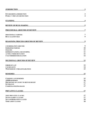 Highly comprehensive notes and exam scaffolds, receiving a high distinction and ranking 3rd in the course. Notes cover the following topics: (1) Jurisdiction (2) Standing (3) Review of rule-making (4) Procedural grounds of review (5) Reasoning process grounds of review (6) Decisional grounds of review (7) Remedies (8) Privative clauses