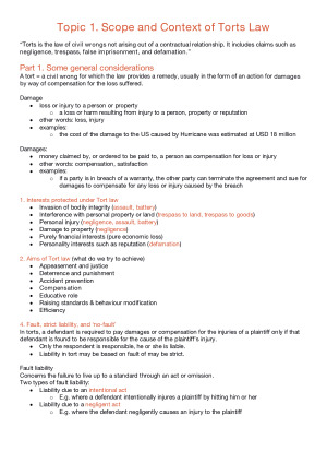 Topic 1: Introduction: Scope and context of tort law – Structure of the course; interests protected; strict and fault-based liability; role of common law and statute; comparisons with no-fault schemes. Topic 2: Historical background of modern tort law: the development of the trespass actions and the action on the case. Introduction to Tort Law. Topic 3: Trespass to the person (continued): false imprisonment. Topic 4: The action on the case for wilful injury: the principle in Wilkinson v Downton. Topic 5: The statutory action for nervous shock. Topic 6: Damages for intentional torts to the person. Topic 7: Defences to intentional torts to the person. RECORDED Topic 8: Negligence: introduction Negligence: duty of care. General principles in novel cases. Topic 8 (continued) Negligence: established categories of duties of care relating to personal injury. Negligence: duties to avoid psychiatric injury. Topic 9: Breach of duty and the standard of care in negligence. Professional standards. Topic 10: Causation, scope of liability and remoteness of damage; the requirement of damage Topic 12: Compensation for personal injuries Topic 13: Vicarious liability. Non-delegable duties. Topic 14: Concurrent, joint and/or several liability for personal injury. Statutory contribution and indemnity rights between multiple concurrent tortfeasors. Tutorial Topic 15: Compensation to third parties of the injured/deceased person and survival claims by the deceased person’s estate. Employer’s action for loss of services.
