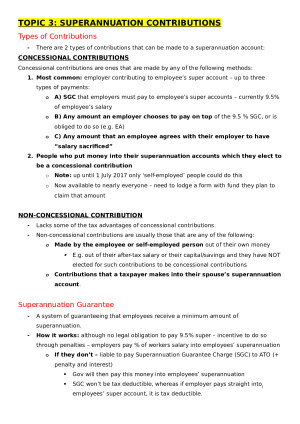 These are my fully comprehensive detailed notes for Superannuation Law MLL227 (Revised for 2024). This is all I used for the exam. I have spent countless hours compiling these notes. My mark was 92 HD for the subject. These notes are comprehensive and integrate everything learnt in the subject, including the prescribed readings from the textbook, lecture notes, tutorial answers, case summaries, etc. Topics include: - Superannuation Contributions - Complying Superannuation Funds - Taxation of Superannuation - Running a Superannuation Fund - Self-Managed Super Funds Hope these help you smash Superannuation Law!