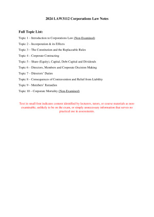 These comprehensive Corporations Law notes (which are HD proven on assessments) cover all topics assessed in the mid-semester assessments (Online Quiz and Written Assignment) AND the exam. With just under 200 pages (197), they are meticulously detailed and have been curated by synthesizing a wide array of authoritative resources, including the course textbook, class PowerPoint presentations, LSS Sketch Notes, Seminar Slides, and most importantly the author's own personal notes from attending lectures and tutorials. BUYER BEWARE: It is a mistake to believe less detailed notes with less pages is sufficient for this unit. Corporations Law has an enormous amount of examinable content and requires detailed notes. I would not have devoted such extensive effort if a lesser approach had been sufficient. The notes not only cover all examinable content but also assist with the structure and answering of questions. They provide detailed steps for addressing different legal issues, along with checklists and pre-formulated case analogies for quick application in scenarios where exam facts correspond with case law. These notes are designed to be the ultimate one-stop resource for Corporations Law, a tool I deeply wished for during my own studies of this unit. Now, you have the opportunity to benefit from hundreds of hours of my meticulous work, all available for a small fee. Topics Included: Full Topic List: Topic 1 – Introduction to Corporations Law Topic 2 – Incorporation & its Effects Topic 3 – The Constitution and the Replaceable Rules Topic 4 – Corporate Contracting Topic 5 – Share (Equity), Capital, Debt Capital and Dividends Topic 6 – Directors, Members and Corporate Decision Making Topic 7 – Directors’ Duties Topic 8 – Consequences of Contravention and Relief from Liability Topic 9 – Members’ Remedies Topic 10 – Corporate Mortality