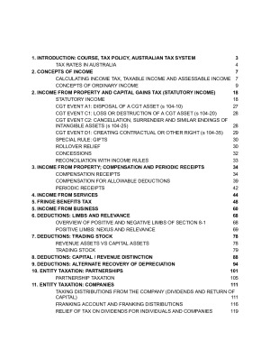 Full set of notes that are EXTREMELY comprehensive with integrated scaffolds which are perfect for the exams (you won't even need the textbook). These notes are all I used for all the exams. I ended up with a final mark of 89. Benefits of my notes: - FULL statutory excerpts from the reading guide have been included (see green boxes). This means you won't even need to look up the legislation - I have also italicised commentary and extra nuanced points where necessary - Detailed case summaries - 150+ pages of notes List of topics: 1. Introduction 2. Concepts of Income 3. Capital Gains Tax 4. Compensation and periodic receipts 5. Income from Services 6. Fringe Benefits Tax 7. Business Income 8. Deductions: Limbs and Relevance 9. Deductions: Trading Stock 10. Deductions: Capital / Revenue Distinction 11. Alternative debt recovery 12. Partnership taxation 13. Company taxation 14. Trusts taxation 15. GST 16. Tax Administration I've included as the sample some notes from Topic 3 about Capital Gains Tax as I think this is the most important and most assessed areas from the unit. Goodluck!!