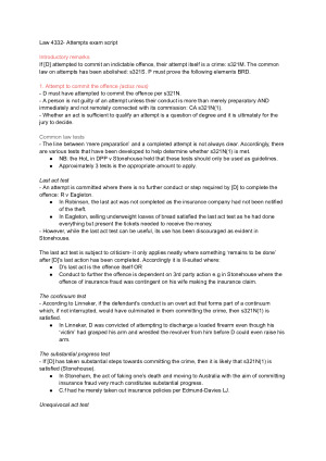 These are the notes that I used to get a 77 in the exam and overall for the unit with one of the highest fail rates in law. They contain a template of sentences that can be used in the exam to save time and a list of arguments and counter-arguments for any scenario that may arise. These notes also contain a summary of the cases focusing on the material facts and the precedent. Topic 1: Introduction/review of principles Topic 2: Criminal procedure Topic 3: Criminal responsibility and defences Topic 4: Strict and absolute liability offences Topic 5: Drug offences Topic 6: Property offences Topic 7: Attempts Topic 8: Complicity