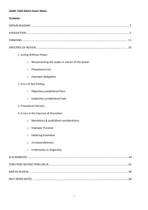 Admin exam notes, covering ALL topics, including key cases and legislation. Analysis of past papers feedback and prediction of exam topics are also included. Super useful and has everything you need in a 2 hour-timed in-person exam! All topics including: - Introduction - Merits review - Judicial review: scope, standing, reasons - Acting without power - Fact-finding errors - Unlawful delegation - Statutory interpretation - Procedural fairness - Errors in discretion - Improper purpose - Relevant/irrelevant considerations - Unlawful use of policy - Unreasonableness - Jurisdictional error - Remedies - Statutory restrictions