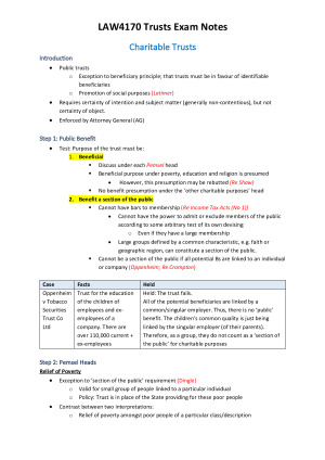 These HD notes were created and compiled for the Semester 1 2021 trusts exam and comprehensively covers the LAW4170 course material. Each topic is set out like an exam-style structure, a logical step-by-step formula covering all the elements. Therefore, these notes are practical, easy to understand and implement when answering exam questions. Additionally, all headings and subheadings are linked to the document index, minimising the amount of scrolling throughout the document. All the relevant legislation provisions (in blue) are included in each topic and case references (in red) are provided for leading statements and factors. These notes also include case facts and what was held (in table format) for all the cases in the reading guide. Topics include: - Introduction and Classification of Trusts - Creation of Express Trusts - Charitable Trusts - Formalities - Constitution - Trustees Duties and Powers - Defences and Limitations on Liability - Rights of Trustees - Rights of Beneficiaries - Remedies Tip: these notes should be adapted for any changes in the course material (including recent cases) and personal preference in style and formatting. Best of luck for the unit!