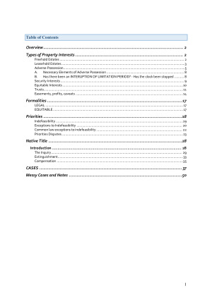 I took property from Tatiana the first year they changed the curriculum to include more native title content and got rid of the stuff like personal property that is in all the notes prior to 2022. I got an H1 on the midterm and the exam in property. The hypo section of my notes is only about 36 pages long. the information is concise and contains the legal tests often in simple 1, 2, 3, step fashion but also still contains some examples of terminology as I know you can get to the end of the semester still sitting there like what in the world is the difference between a lien and charge. The notes contain multiple flow charts and diagrams. In the native title section I have charts as well with the statutory section number on the left and the case law commentary which dictates how that section is to be applied on the right so you have everything in one spot since the case law commentary on the statute is really important for that section. I also have the most notable cases that matter for the hypothetical listed in my cases section after the hypo notes. I then have an additional section of casenotes and article summaries on two of the native title readings since I predicted that was going to be an essay question my year. I copied and pasted those more messy notes into the notes. I apologise they arent as well planned out as the rest, it was a last minute copy paste before putting notes up here. I just wanted to include everything I had even the stuff that wasnt picture perfect ready. Just as a note, when I took property there were still covid testing systems in place so it wasnt in person but online where I used control f for everything. I did a random generated table of contents for your convenience, but it definitely could be improved upon if you want to bother with it. Just convert the pdf back into a word document and use the style headings thingy for what you want to appear in a table of contents and then go to references section and generate a table of contents in there.