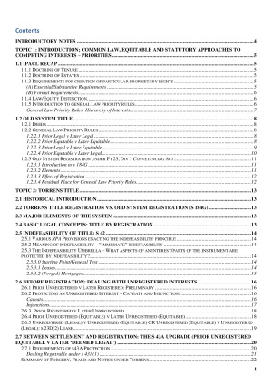 High Distinction Real Property notes, covering all topics, including key cases and legislation complied from the textbook, classes and lectures. Achieved a HD (85%) in Real Property (LAWS2017) using these notes in-class and for the exam. All topic including: - Introduction and Doctrine of Tenure and Estates - Creation of Property Rights - Old System Tittle - Torrens Title - Registration - Indefeasibility - Unregistered Interests - Exceptions to Indefeasibility - Co-Ownership - Easements and Profits à Prendre - Covenants - Leases and Licenses - Mortgages - Tracking