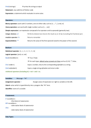 A friend of mine has his mark raised from 60% (MST) to 85% (Exam) after utilising this summary. These notes offer condensed summaries organized around individual concepts, facilitating efficient comprehension and retention. With these study aids, I achieved a perfect score of 100 in this subject, and I am confident they can empower you to elevate your WAM as well, even if you have only one night left to prepare for your exam. Don't miss out on this opportunity to supercharge your understanding and performance. Topics include: - Operators - Boolean - Variables - If statement - Sequence - String - F string - List - Tuple - For loop - While loop - Iterable - Dictionary - None type - Errors - Recursion