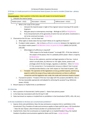 BENEFITS - These notes provide you with order and structure in how you approach problem questions. - You can just copy the notes into your responses (or do some minor re-tweaking) and then apply your facts in sections that are highlighted. It really makes it that simple. - I promise you that these notes will the best set of notes that you will ever receive. I spent hundreds of hours perfecting these notes into these notes. LEGEND - Light Blue = Answer Structure - Pink = Case Names - Red / Bold = Anything Key to Note Topics covered: Topic A: Principles of Constitutional Law/ Trade & Commerce Power Topic B: Inconsistency Topic C: External Affairs Power Topic D: Corporations Power Topic E: Freedom of Interstate Trade Topic F: Taxation and Grants Topic G: Defence Power Topic H: Implied Freedom of Political Communication Topic I: Intergovernmental Immunities