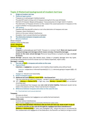 1. Introduction scope and context of tort law 2. Historical background of modern tort law 3. Modern trespass to the person: Battery, Assault and False Imprisonment 4. Action on the case for wilful injury(indirect & intentional) 5. The Statutory Action for Nervous Shock 6. damages of intentional torts 7. Defences to intentional torts 8. Negligence Duty of Care 9. Breach of Duty and remoteness of damage/scope of liability