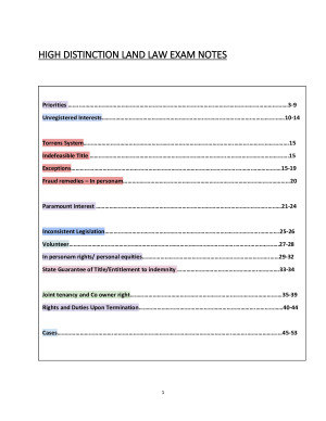 These are exam notes that you can essentially use for the exam to build your exam answers. I received 85% overall. The notes are colour coded and a mix of exam answer structures with lecture notes. I think once learning the content you will realise that the questions are more or less - priorities / unregistered interests - torrens land (aka registered interest) question - joint tenancy question Priorities ……..………………………………………………….3-9 Unregistered Interests……………….……………10-14 Torrens System………….……….………….…………….15 Indefeasible Title …………….………………….15 Exceptions……….……….……….……….……………….15-19 Fraud remedies – In personam………………………20 Paramount interest ……………………………….……21-24 Inconsistent Legislation………….………….25-26 Volunteer……………………………….….27-28 In personam rights/ personal equities………29-32 State Guarantee of Title/Entitlement to …................................................................................33-34 Joint tenancy and Co owner right………………35-39 Rights and Duties Upon Termination…………40-44 Cases……………………………..……………….…45-53