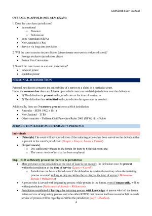 Handy problem-question scaffold for both mid-sem exam and final exams. Topics covered: 1. Personal jurisdiction: at common law; service in Australia, service in New Zealand 2. Personal jurisdiction: service outside Australia 3. Discretionary non-exercise of jurisdiction: foreign jurisdiction clauses 4. Discretionary non-exercise of jurisdiction: forum non conveniens; intra-Australian and New Zealand cases 5. Anti-suit injunctions 6. Choice of law in Australia; characterisation 7. Substance and procedure 8. Foreign law 9. The law applicable to torts 10. The law applicable to contracts 11. Mandatory rules and the law of the forum 12. Recognition and enforcement of foreign judgments