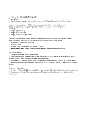 The exam was quite easy with these notes. Contains: Topic 1: The Concept of Property Topic 2: Personal Property: Acquisition, Alienation and Possession Topic 3: Personal Property: Title, Bailment, Proprietary Remedies and PPSA Topic 4: Limits of Land and Fixtures Topic 5: Tenure, estates, future interests and the rule against perpetuities Topic 6: Possession of Land Topic 7: Native Title