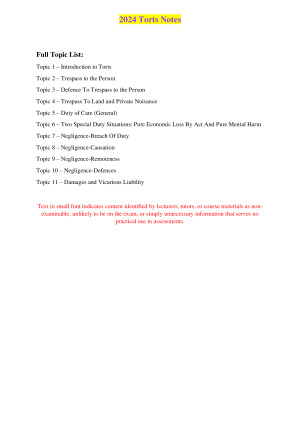 These comprehensive Torts Law notes (which are HD proven on assessments) cover all topics assessed in the mid-semester assessments AND the exam. With over 90 pages, they are meticulously detailed and have been curated by synthesizing a wide array of authoritative resources, including the course textbook, LSS Sketch Notes, class PowerPoint presentations, Seminar Slides, and most importantly the author's own personal notes from attending lectures and tutorials. The notes not only cover all examinable content but also assist with the structure and answering of questions. They provide detailed steps for addressing different legal issues, along with checklists and pre-formulated case analogies for quick application in scenarios where exam facts correspond with case law. These notes are designed to be the ultimate one-stop resource for Torts, a tool I deeply wished for during my own studies of this unit. Now, you have the opportunity to benefit from hundreds of hours of my meticulous work, all available for a small fee. Full Topic List: Topic 1 – Introduction to Torts Topic 2 – Trespass to the Person Topic 3 – Defence to Trespass to the Person Topic 4 – Trespass to Land and Private Nuisance Topic 5 – Duty of Care (General) Topic 6 – Two Special Duty Situations: Pure Economic Loss by Act and Pure Mental Harm Topic 7 – Negligence-Breach of Duty Topic 8 – Negligence-Causation Topic 9 – Negligence-Remoteness Topic 10 – Negligence-Defences Topic 11 – Damages and Vicarious Liability