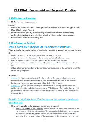 ADVANTAGES OF NOTES - Notes cover every examinable topic for the College of Law Practical Legal Training Commercial and Corporate oral assessment (including the tasks that are required to be submitted prior to the oral). - Notes are broken down by task (to follow the style and order of questioning in oral assessment). - You can simply just read from these notes when responding to questions asked by assessor. - Notes include comments based on feedback from lecturers on activity submissions and the practice papers supplied by the College of Law. TOPICS COVERED IN NOTES - Reflection on learning - Task 1: Advising a vendor ob the sale of business - Ways to sell a business - Type of contracts - Seller vs vendors lawyer - Buyer vs purchaser lawyer - Caveat emptor - Drafting contract - Goodwill - Restraints of trade - Stock in trade - Standard contracts - Conditions - Key documents - Pre-settlement - Post settlement - Task 2: Advising a purchaser on the purchase of business - Due diligence - Security interests - Settlement statements - Personal property - PPSR - Advising on tax - Task 3: Setting up business structrues - Limited liability - Trusts - Equity vs debt financing - Loans - Relevant ASCR Sections - Sample Questions (contained with each topic)