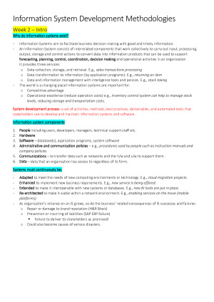 Concise and recent ISDM notes. I used subheadings and colour-coding to divide the material in a clear and understandable way, which was especially helpful when trying to locate a specific piece of info. These notes cover all topics (weeks 2-10) 2. Introduction 3. Method Engineering 4. A design perspective on ISD, agility and design thinking 5. Design thinking process and ISD 6. Design thinking process and ISD 2 7. Scrum process, guidelines and roles 8. Review of OO technology review and RUP process 9. Further OO techniques 10. Method evaluation and method engineering
