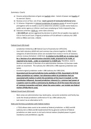 I used these LLB2230 notes to achieve a final result of 86% in this challenging subject (top 2-3% of the LLB cohort). My notes include both substantive legal rules/cases to address problem questions AND theorist views/essay-type content to answer the essay question for the exam too. I have structured the notes using a variety of techniques including bullet points, tables and flow charts for the clearest understanding of the subject content. Topics covered include: • Introduction to Administrative Law, including key concepts ( separation of powers) • Functions of Federal Executive Agencies, Federal Courts etc. • Nature and Framework of Merits Review • Procedure, Evidence and the role of policy in Merits Review • Judicial Review- Framework and Jurisdictional Limitations, judicial vs executive power • Standing • Unauthorised Decisions, Legality and Jurisdictional Error • Unauthorised Purpose, Considering Irrelevant Matters, Failure to consider Relevant Matters • Wednesbury unreasonableness, Procedural Fairness (general principles and rule against bias) • Procedural Fairness (right to a hearing) • Remedies in Administrative Law