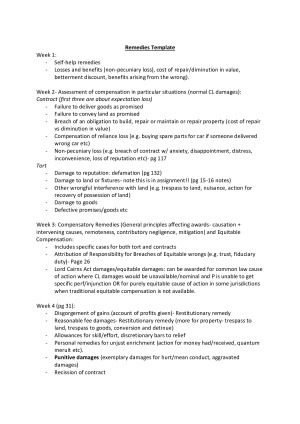 I utilised these notes to achieve a very strong Distinction mark. These notes provide succinct explanations and a legal context of the relevant legal and equitable remedies studied in the subject. Relevant case citations and sources are cited. They also provide a useful outline to structure and compartmentalise the various components of this challenging subject. Topics included: Self-help remedies Losses and benefits (non-pecuniary loss, cost of repair/diminution in value, betterment discount etc) Assessment of compensation in particular circumstances Compensatory remedies- principles affecting awards, causation, intervening causes, remoteness, contributory negligence, mitigation Equitable compensation Restitutionary remedies and punitive remedies, including account of profits, reasonmable fee damages, discretionary bars to relief, unjust enrichment, punitive damages, recission of contract Coercive remedies, including specific performance, injunctions, enforcement of remedies including through injunctions Australian Consumer Law remedies