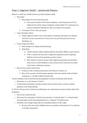 Summary notes of all content covered in the semester during lectures. Content: - 1: Legal but sinful: alcohol and tobacco - 2: Addiction and opioids - 3: Illicit drugs on the street - 4: The Hype and Hope of COVID treatments - 5: Vaccinations - 6: Birth control