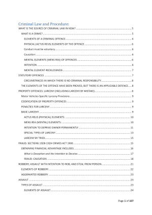 WHAT IS THE SOURCE OF CRIMINAL LAW IN NSW? 3 WHAT IS A CRIME? 3 STATUTORY OFFENCES 5 THE ELEMENTS OF THE OFFENCE HAVE BEEN PROVED, BUT THERE IS AN APPLICABLE DEFENCE 5 PROPERTY OFFENCES: LARCENY (INCLUDING LARCENY BY MISTAKE) 6 Motor Vehicles-Specific Larceny Provisions 6 CODIFICATION OF PROPERTY OFFENCES 7 PENALTIES FOR LARCENY 7 BASIC LARCENY 7 FRAUD: SECTIONS 192B-192H CRIMES ACT 1900 13 OBTAINING FINANCIAL ADVANTAGE INCLUDES 14 ROBBERY; ASSAULT WITH INTENTION TO ROB; AND STEAL FROM PERSON 19 ELEMENTS OF ROBBERY 19 AGGRAVATED ROBBERY 20 ASSAULT 21 TYPES OF ASSAULT 21 SIMILAR AGE DEFENCE 41 THE CONDUCT (PHYSCIAL ELEMENTS) OF MURDER THE CONDUCT OF MURDER 42 ELEMENTS OF MURDER 42 PHYSICAL ELEMENTS OF MURDER AND MANSLAUGHTER 43 PHYSIAL ELEMENTS OF MURDER AND MANSLAUGHTER (CONT.)-DEATH OF A HUMAN BEING 43 PHYSICAL ELEMENTS OF MURDER AND MANSLAUGHTER (CONT.)-CAUSATION 44 THE MINDS (MENTAL ELEMENTS) OF MURDER AND INVOLUNTARY MANSLAUGHTER THE MENTAL ELEMENTS OF MURDER 46 INTENTION TO KILL 46 EXTREME PROVOCATIONTHE DEFENCE OF EXTREME PROVOCATION -SECTION 23 CRIMES ACT 1900 51 HISTORICAL BACKGROUND 52 ELEMENTS OF EXTREME PROVOCATION 53 CONDUCT OF THE DECEASED TOWARDS OR AFFECTING THE ACCUSED 53 THE CONDUCT OF THE DECEASED IS A SERIOUS INDICTABLE OFFENCE 53 THE CONDUCT OF THE DECEASED CAUSED THE DEFENDANT TO LOSE SELF CONTROL 54 THE CONDUCT OF THE DECEASED WOULD HAVE CAUSED AN ORDINARY PERSON TO LOSE SELF CONTROL SO AS TO FORM AN INTENTION TO KILL OR CAUSE GBH 55 First Limb-Gravity of Provocation 55 Second Limb-Reaction of the Defendant 55 SELF INDUCED INTOXICATION AND CONDUCT WHICH CANNOT BE EXTREME PROVOCATION 56 SELF DEFENCE SELF DEFENCE: THE POSITION AT COMMON LAW 57 SELF DEFENCE: THE POSITION IN NSW 58 Self Defence and Self-Induced Intoxication 59 ‘EXCESSIVE’ SELF DEFENCE REDUCING MURDER TO MANSLAUGHTER-SECTION 421 CRIMES ACT 60 SELF DEFENCE-EXAMPLES OF WHEN THE DEFENCE SUCCEEDED AND FAILED 61 THE DEFENCE OF DURESS 62 ELEMENTS OF DURESS 62 The Objective Element of Duress 64 DURESS: TYPE OF HARM - THREAT REASONABLE BELIEF 65 DURESS: ORDINARY FIRMNESS OF MIND 65 DURESS-PURPORTED EXPERT EVIDENCE OF A PSYCHIATRIST OF MATTERS THAT ARE NOT THE PROPER SUBJECT OF EXPERT EVIDENCE 66 DURESS- VOLUNTARY INVOLVEMENT WITH CRIMINAL GROUP 66 DURESS: MURDER (IN SOME CIRCUMSTANCES) EXCLUDED 67 DEFENCES OF: (1) NECESSITY; (2) INSANITY AND (3) DIMINISHED 68 THE DEFENCE OF NECESSITY 68 THE DEFENCE OF NECESSITY-DOES NOT APPLY TO MURDER 69 THE DEFENCES OF (1) INSANITY; AND (2) DIMINISHED RESPONSIBILITY 70 THE DEFENCE OF INSANITY-ELEMENTS 70 DIMINISHED RESPONSIBILITY: S 23A CRIMES ACT 1900 (NSW) 71 THEDEFENCE OF AUTOMATISM 73 AUTOMATISM-DISTINCTION BETWEEN THE DEFENCES OF INSANITY AND AUTOMATISM 73 THE DEFENCE OF AUTOMATISM-ELEMENTS 74 INTOXICATION 76 INTOXICATION-THE POSTION AT COMMON LAW 76 COMPLICITY 81 COMPLICITY-JOINT CRIMINAL ENTERPRISE 86 ATTEMPT-INTRODUCTION 88 ATTEMPT-ELEMENTS 89 ATTEMPT-THE MENS REA OF ATTEMPTED MURDER 90 CRIMINAL PROCEDURE IN NSW POWERS OF INVESTIGATION 91 POWERS OF INVESTIGATION-WARRANTS 93 POWERS OF INVESTIGATION-SEARCH WARRANTS 94 POWER OF INVESTIGATION-ENTRY INTO PREMISES WITHOUT SEARCH WARRANT 94 POWERS OF INVESTIGATION-TERRORISM OFFENCES 95 POWERS OF ARREST 95 ARREST WITHOUT WARRANT 95 DEFINITION OF ARREST 97 ARREST-THE USE OF REASONABLE FORCE TO EFFECT AN ARREST 99 ADMISSIONS-PROVISIONS OF THE EVIDENCE ACT 1995 (NSW) REGARDING EXCLUSION OF THE ADMISSION FROM EVIDENCE AT THE TRIAL 103