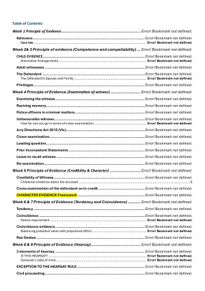 Note contains templates for some important topics. It will guide you through the topic step by step including tips to answer questions and how to structure your answer. Comprehensive note including the following topics: 1. Relevance 2. Competence and compellability 3. Privilege 4. Examination of witness including examination in chief, cross examination and re-examination 5. Character and credibility of witnesses (s 101A- 103 Evidence Act) 6. Right to silence (Crimes Act, Evidence Act, Criminal Procedure Act, Jury Direction Act) 7. Tendency evidence and coincidence evidence (Part of Evidence Act, Part 5, Div 2 of Jury Direction Act) 8. Hearsay and its exception (ss 59, 60 and 61 of Evidence Act) 9. Admission (Part Evidence Act) 10. Illegally obtained evidence (ss 138, 139 Evidence Act) 11. Opinion Evidence