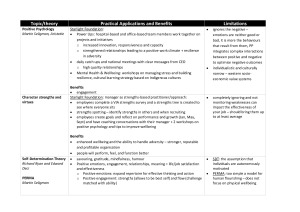 A summary of the theories taught in the subject and useful to help prepare for assignments and the final exam. Under each theory there are its practical applications, benefits and limitations. Topics are: - Positive Psychology - Character strengths and virtues - Self-Determination Theory - PERMA - Broaden-and-build Theory - Mindfulness - Stress, Resilience, and Optimism - Happiness and wellbeing - Positive and Authentic Leadership - Compassion