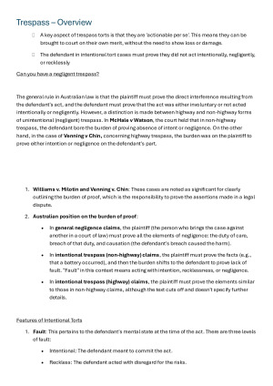 Comprehensive and clear notes for Tort Law. A lot of times, it can get messy trying to extract relevant notes and principles and I have tried my best to clear out any confusion and cluster of irrelevant information. For each Tort, I have included and filtered case law, with a further division into Facts-Outcome. This will way you will not have to scan different documents or wonder which case is relevant. Good luck with your studies :) Topics: Assault Battery False Imprisonment (+ Psychological coercion) Trespass to land, goods Conversion Detinue Private and Public Nuisance Defamation Negligence Negligence in specific situations (medical, sports, pure economic loss) Vicarious Liability Non-delegable Duty -> Remedies (General) -> Elements, liabilities, Defences, Damages are all included within each topic